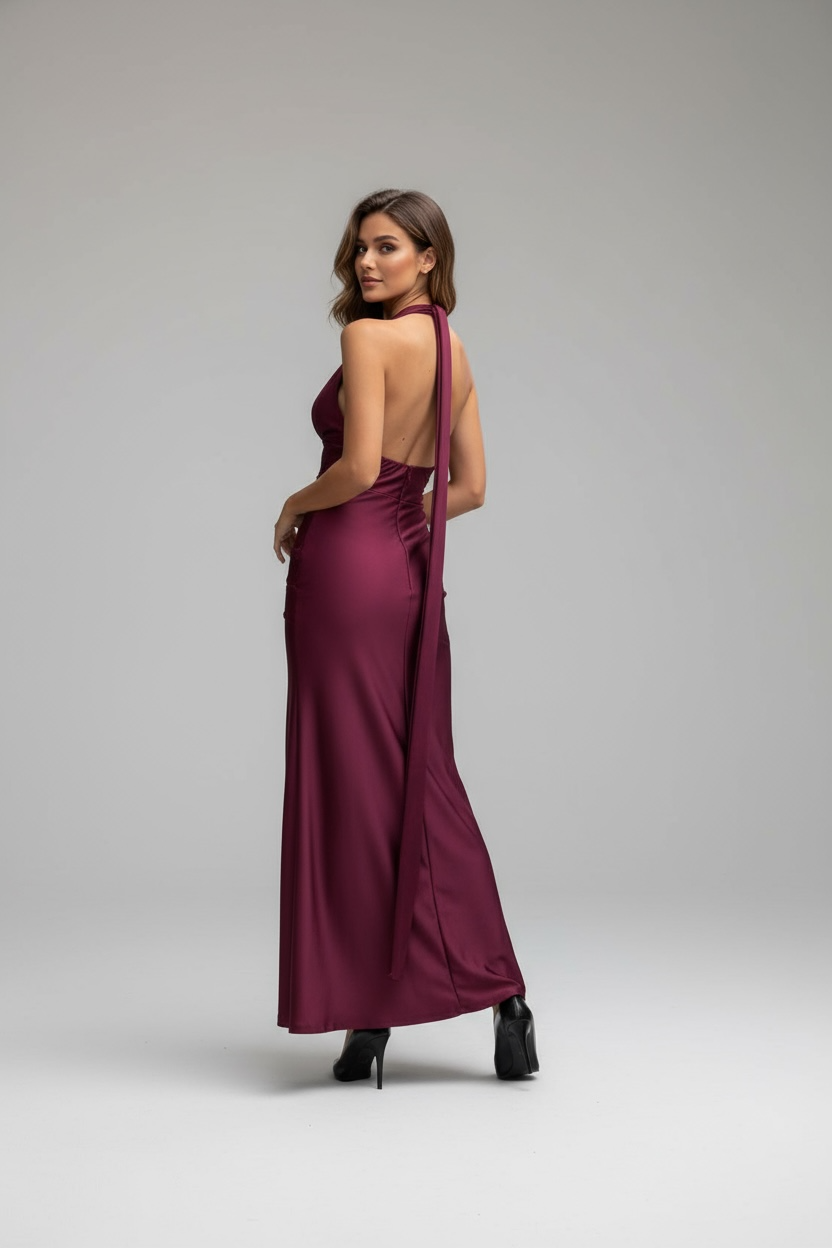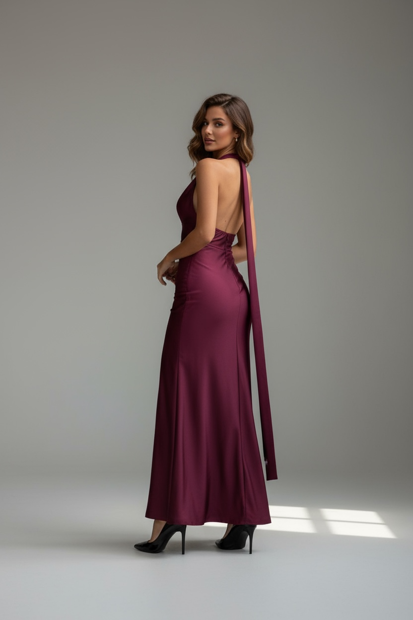 Abito lungo bordeaux con schiena scoperta e spacco frontale