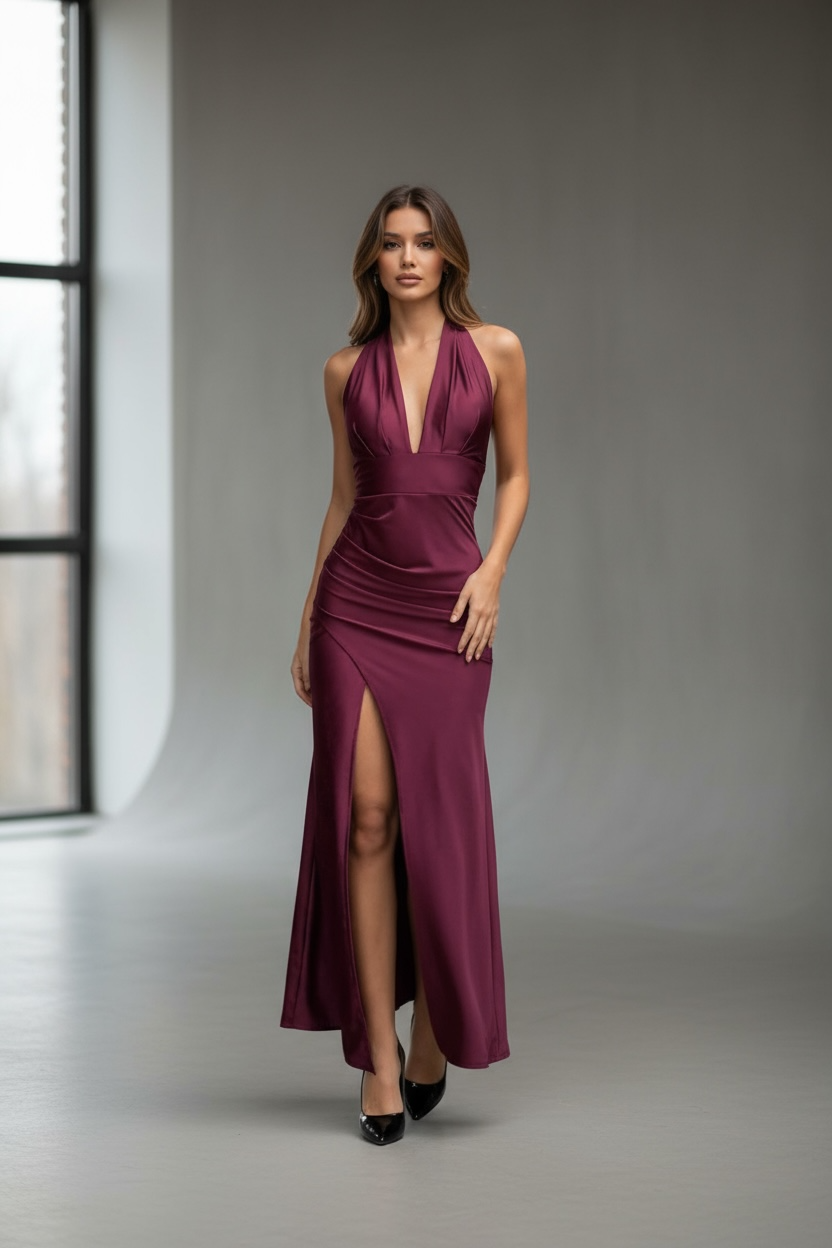 Il dettaglio dello spacco frontale aggiunge movimento e slancia la figura, rendendo questo modello ideale per eventi serali, cerimonie o serate di gala. Il collo allacciato dietro la nuca crea un effetto elegante e moderno, mentre la fascia in vita sottolinea con grazia le curve naturali.